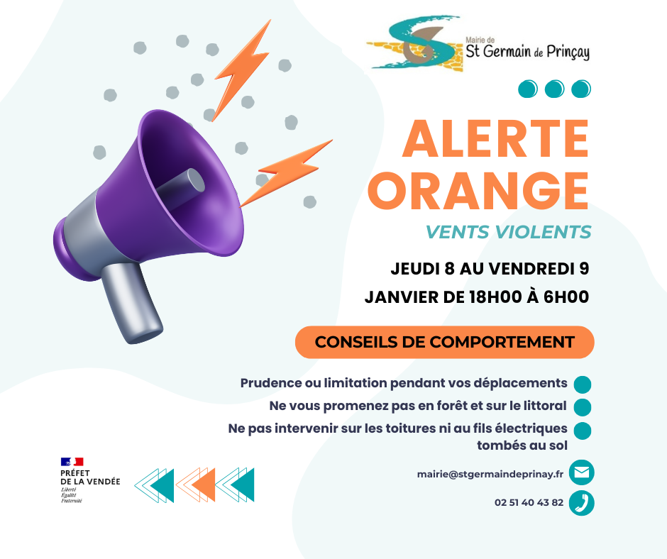 Mise en alerte météo  vents violents de niveau orange signée par Monsieur le Préfet de la Vendée.