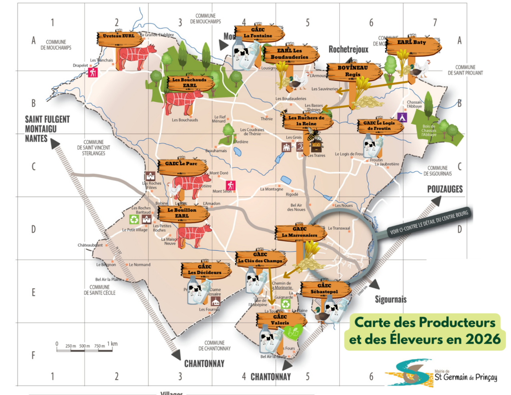Sur la commune de Saint Germain de Prinçay, l’activité agricole se répartit entre l’élevage bovin lait et viande, les céréales et le hors sol. Quelques exploitations proposent une vente directe de leurs produits.